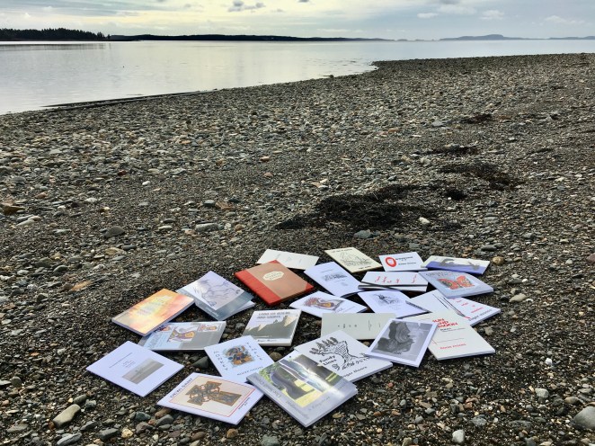 Moo tells me that my books will never be burned. And I am thankful for that. I asked why they wouldn’t be and he replied that nobody reads them anyway! Not such a comforting thought. So, in an effort to keep me happy and to preserve my books from the flames, another of my friends laid them out on the beach at Holt’s Point, New Brunswick. They certainly won’t burn when the tide comes in.