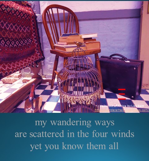 Haiku out of Africa my wandering ways ~ are scattered in the four winds ~ yet you know them all ©Lize Bard View original postShare this: Share on X (Opens in new window) X Share on Facebook (Opens in new window) Facebook Email a link to a friend (Opens in new window) Email More Share on LinkedIn (Opens in new window) LinkedIn Share on Tumblr (Opens in new window) Tumblr Share on Pinterest (Opens in new window) Pinterest Like Loading...