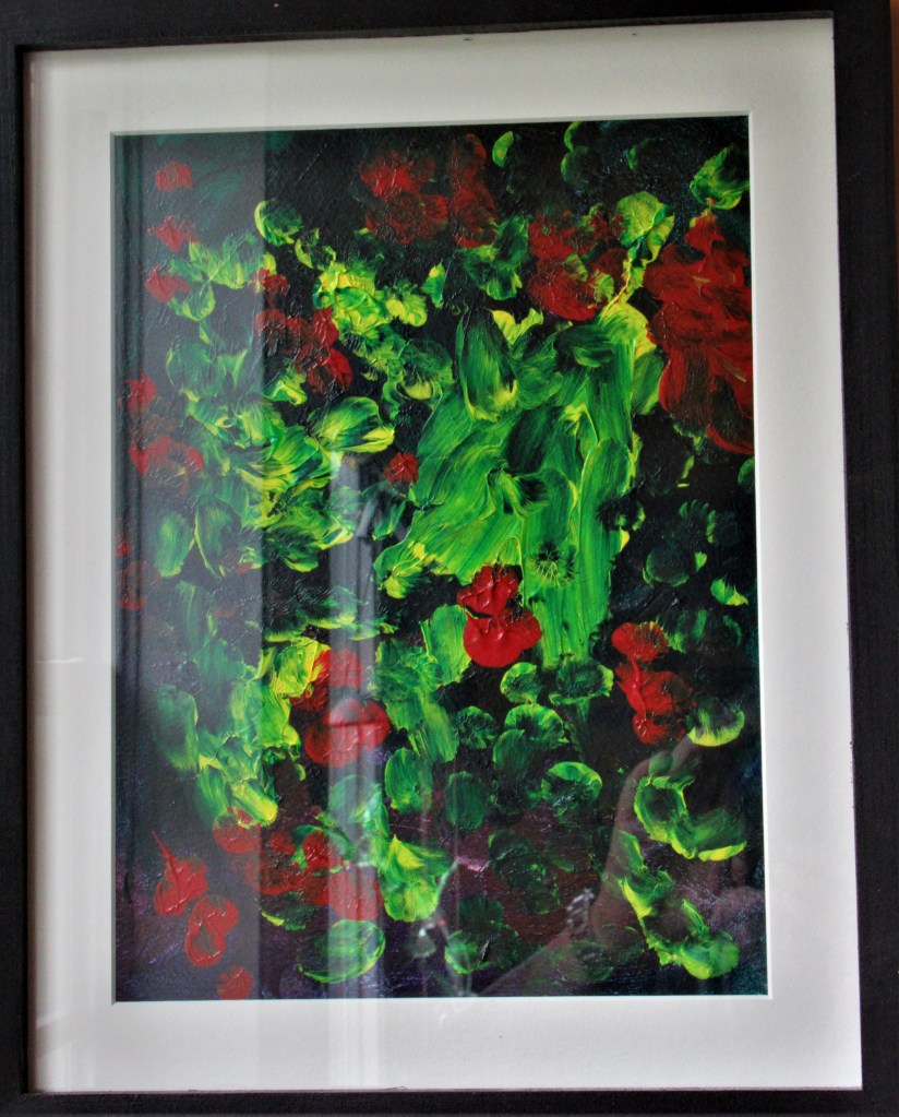 Every trip to Kingsbrae Garden in St. Andrews, New Brunswick, opens my eyes to more beauty. Yesterday, I brought back this painting, Night Garden, and placed it on the wall by the garage door so I would see it regularly when entering and leaving the house. Alas, I caught the reflection from the window in the photo, but the night flowers and their colouring make up for any lapses in my amateur photography.