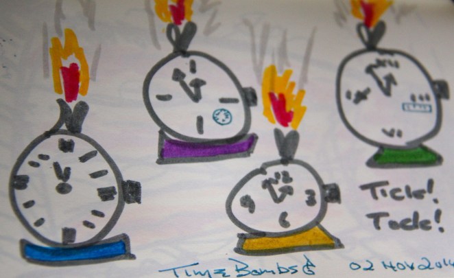 Well, Moo has done me proud this time. Two early paintings, both depicting aspects of time, as conceived by Moo. In the first, time is seen as a tick-tock time bomb, or rather a set of tick-tock time-bombs. In the second, in imitation of Salvador Dali (Moo always set his sights high!), a clock going over a water fall and the hours flying off the clock face as time bends. So, tell me if you can, what is time?