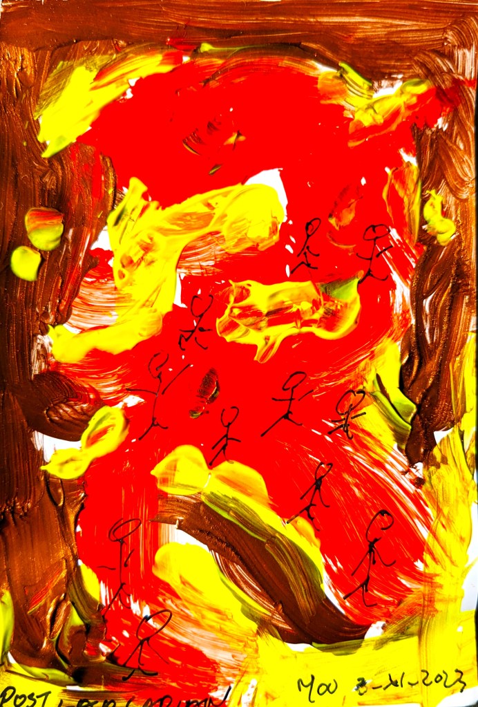 As for the painting, by my good friend Moo, that shows The Fall – Pre-Lapsarian / Post-Lapsarian – when all the devils, demons, and black angels were tumbled out of Paradise and abandoned to the depths below, where, alas, they still roam. So, if you meet any of them along the way, shove them in that old kit bag and get rid of them too. You’ll feel much better afterwards.