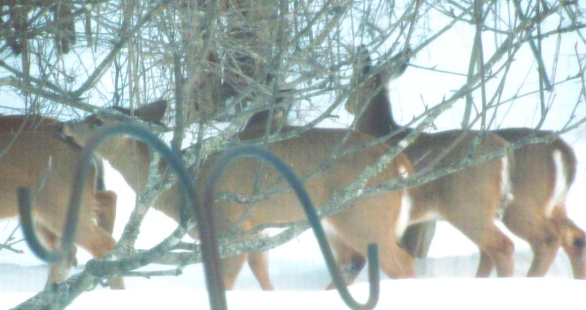 Sheep in Wales and deer in Canada. And here is a little group wandering around in our garden. So how do I explain the deer? They are everywhere, I say, on lawns and in gardens. I once knew a man whose every green leafed plant was devoured by a herd of deer, who sneaked into the garden the day he left the gate ajar. They get everywhere, I say, everywhere. And everybody loves them, because the heart beats a little faster when you see them walk by.
