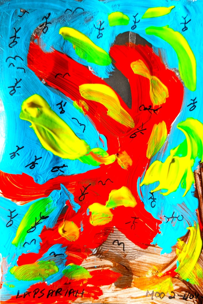 “Can an absence be a presence?” Good question I asked Moo that and he showed me several paintings of trees in winter and vacant faces that he had knowingly filled with sorrow. But I preferred the image of “I only see a winter garden with withered blossoms on a leafless tree.” So I chose my own photo. Moo was very upset and asked me to put in one of his winter paintings anyway, so here it is.