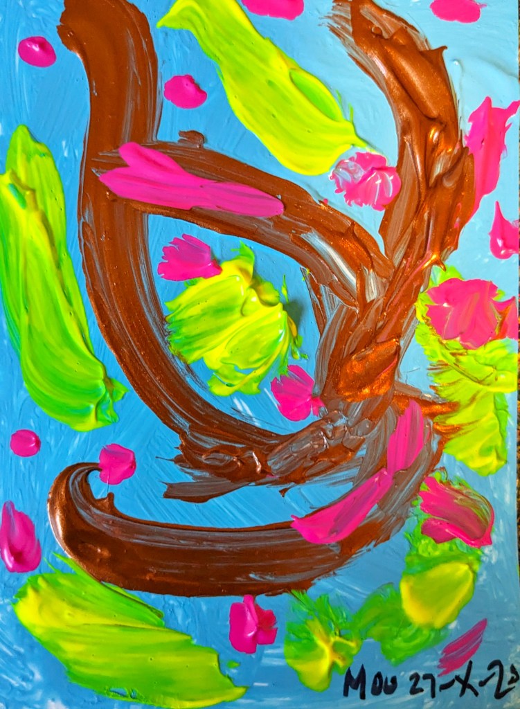 “And time has ticked a ribbon round the stars.” Dylan Thomas, sort of, but a perfect title for this painting that I completed this morning. The acrylic paint is still wet! I brought it downstairs, looked at it in the light from the kitchen window, and the colors had all changed. I angled the painting, then re-angled – it was a chameleon changing color in the shifting light. Then I turned the large ceiling lights on – and this is what I saw.