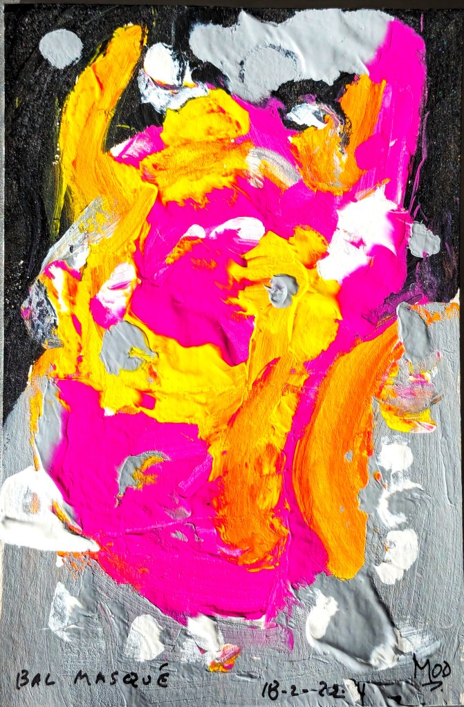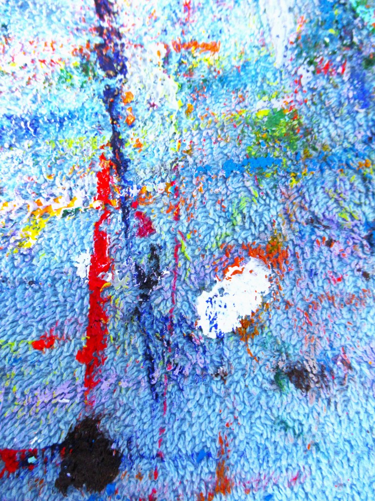 “Good questions,” Moo replied. “Difficult to answer, though.” First of all, this is not a painting. It is the background cloth, always changing, always in transition, upon which I create my post card paintings. The idea of transition summarizes the movement from paint, to brush, to painting, and the haziness of the creative moment. It relates directly to your lines ‘Scales fall from my listening eyes / and all-seeing ears.’ This is the point in time, the magic moment, when the painting declares itself. I assume you have the same moment when you write poetry.”