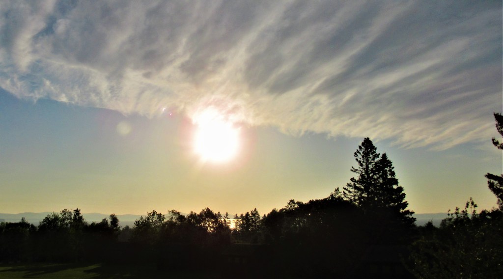 Comment: Another moment of magic: this is the morning of the partial eclipse (Thursday, 10 June, 2021). However, there’s enough cloud cover for me to have missed the actual moments of the eclipse. That said, the sun is all distorted and not at all clear, as it usually is when seen early from the Red Room, nor is it the same rich colors at all, so perhaps I did catch something worthwhile after all. More than worthwhile, this too is a magic moment.