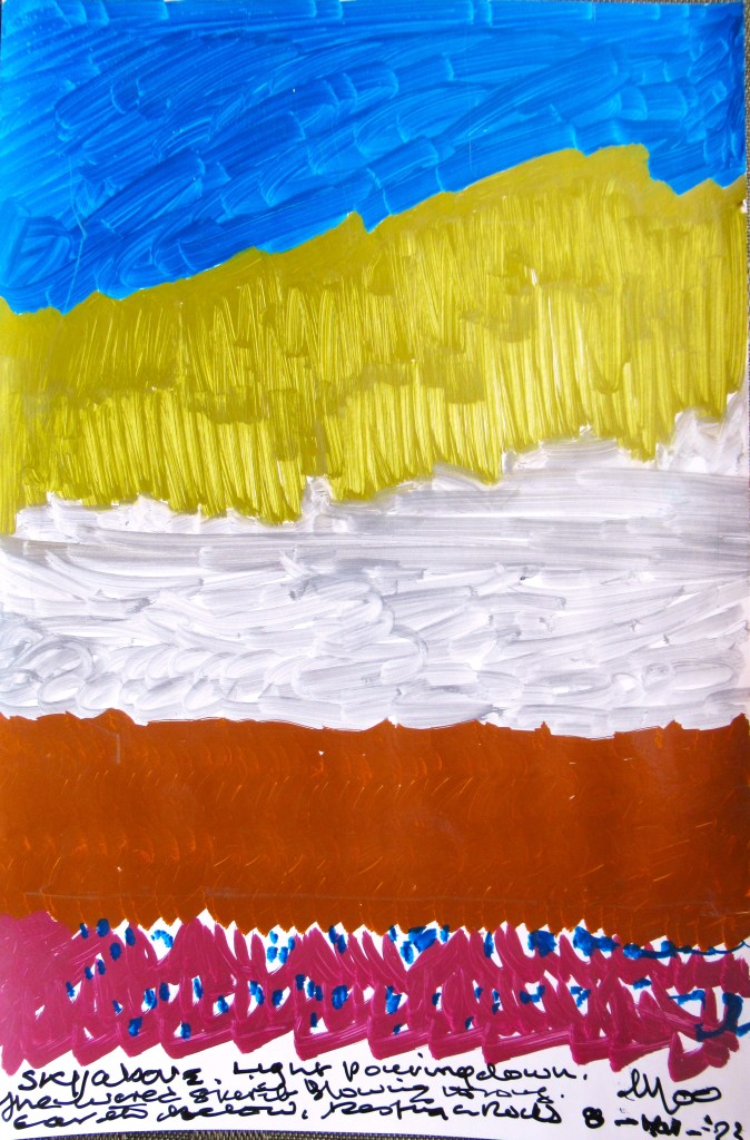 … and suddenly, one day on the beach, it started to rain … one small cloud turned into a big one … and the sky became black … from out of nowhere, a great clap of thunder and the storm scene from Beethoven’s Sixth Symphony, the Pastoral, came resounding down in a shower of sound and everybody was running for shelter … into caves … under cliffs … under trees, on the far side of the rocks out of the wind, and the water, and the horizontal tide of rain that brought relief from the heat … and some of us just stood out there … under the waterfall … enjoying the soaking … watching the water run over our hands, our faces, and our skins …